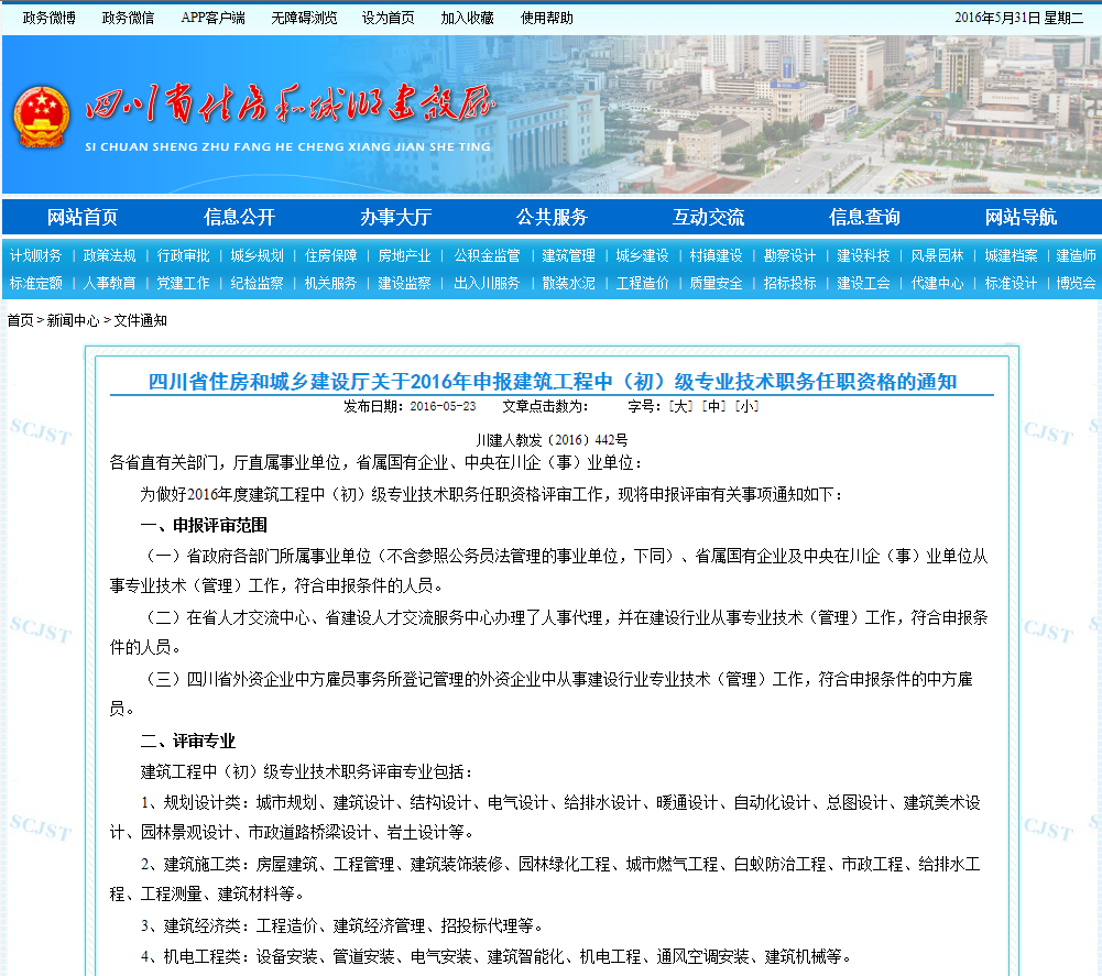 各省直有關部門,廳直屬事業單位,省屬國有企業、中央在川企(事)業單位: 為做好2016年度建筑工程中(初)級專業技術職務任職資格評審工作,現將申報評審有關事項通知如下: 一、申報評審范圍 (一)省政府各部門所屬事...