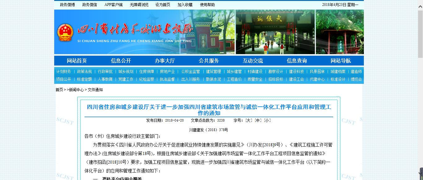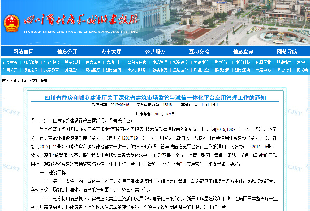四川省住房和城鄉建設廳關于深化省建筑市場監管與誠信一體化平臺應用管理工作的通知 發布日期:2017-03-16文章點擊數為: 45318 字號:[大...