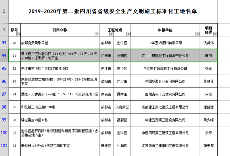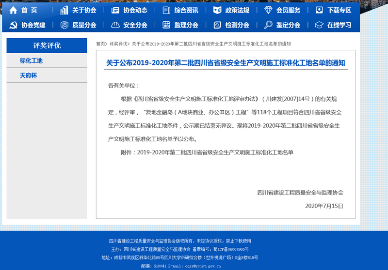 2020年7月15日,經四川省建設工程質量安全與監理協會考評,四川中建建業工程有限責任公司新民棚戶區改造項目榮獲2019-2020年第二批“四川省省級安全生產文明施工標準化工地”稱號。