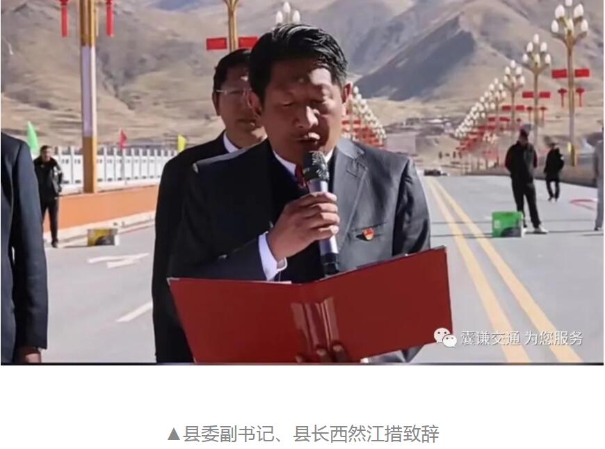 囊謙縣委副書記、縣長西然江措在致辭中說:今天開通南大橋不僅是一座便民橋,也是一座富民橋,更是一座連心橋。我們要充分發揮扎曲河南大橋紐帶連接作用,促進東西兩岸有序流動、交換提速和公共資源均衡配置;我們要聚焦民之所盼、民之所向,繼續保持“逢山開路、遇河架橋”的奮發勁頭,加快解決群眾“急難愁盼”事項;我們要秉承南大橋“魚躍龍門、年年富余”的美好寓意,打造更多經得起歷史檢驗、經得起人民檢驗的“精品工程”“民心工程”。大家要以此次開通為新起點,始終與群眾手牽手、心連心,同人民想在一起、干在一起,風雨同舟、同甘共苦,凝心聚力把富強美麗平安幸福囊謙建成老百姓希望的模樣。