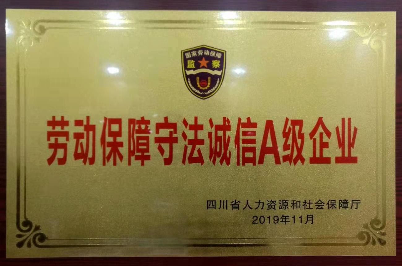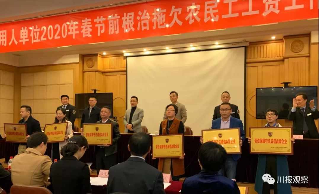 2019年11月12日,在省級用人單位2020年春節前根治拖欠農民工工資工作部署會上,四川省人力資源和社會保障廳對在勞動保障、守法誠信等方面發揮標桿作用的25家企業進行表彰,四川中建建業工程有限責任公司榮獲“勞動保障守法誠信A級企業”稱號。